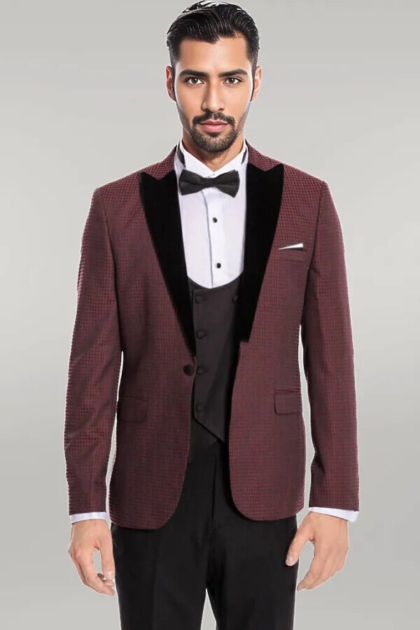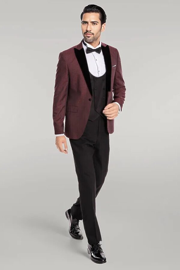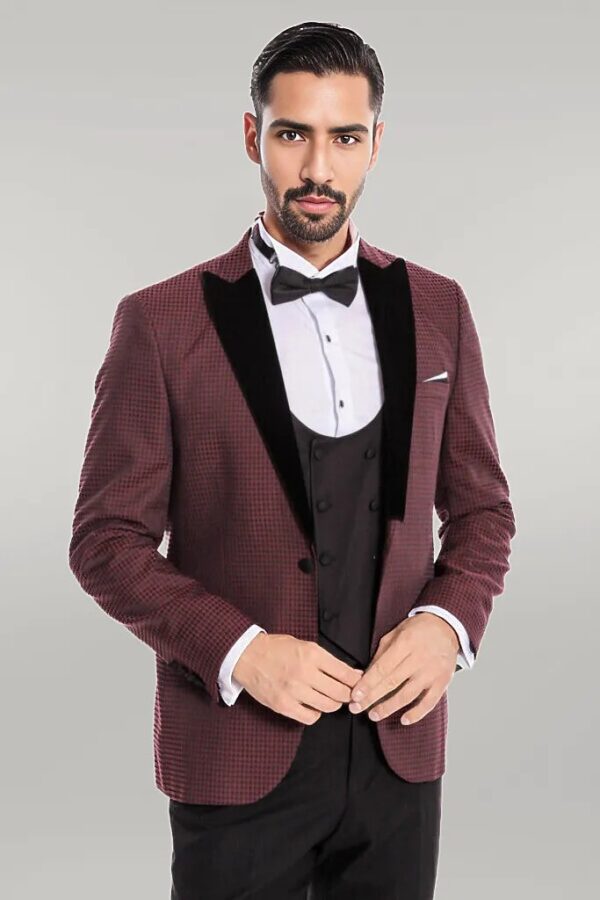 It is a very stylish suit model with its model, shape and color. The jacket of this suit is burgundy and checkered pattern. This jacket, which has a single button, has a black and pointed collar. It is a slim fit jacket with double slits. It has a double-breasted black jacket and a patternless jacket. It is the third piece of this suit in a straight-fit black and straight pants. It is a very stylish model.